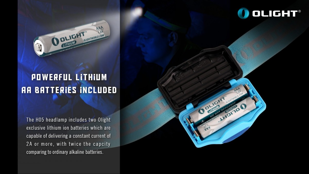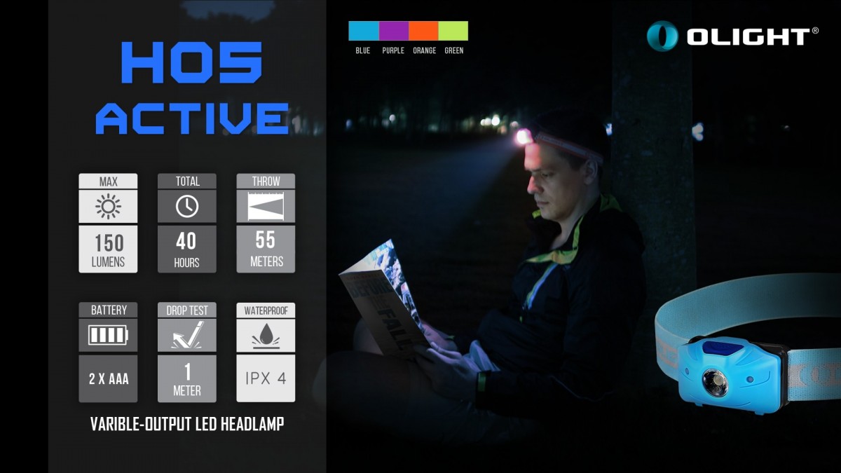 Olight H05 Active – універсальний, компактний та легкий налобний ліхтар. Його вага становить лише 40 г без елементів живлення, а максимальна яскравість сягає 150 люменів. Працює ліхтар від поширених елементів живлення — мізинчикових батарейок.
