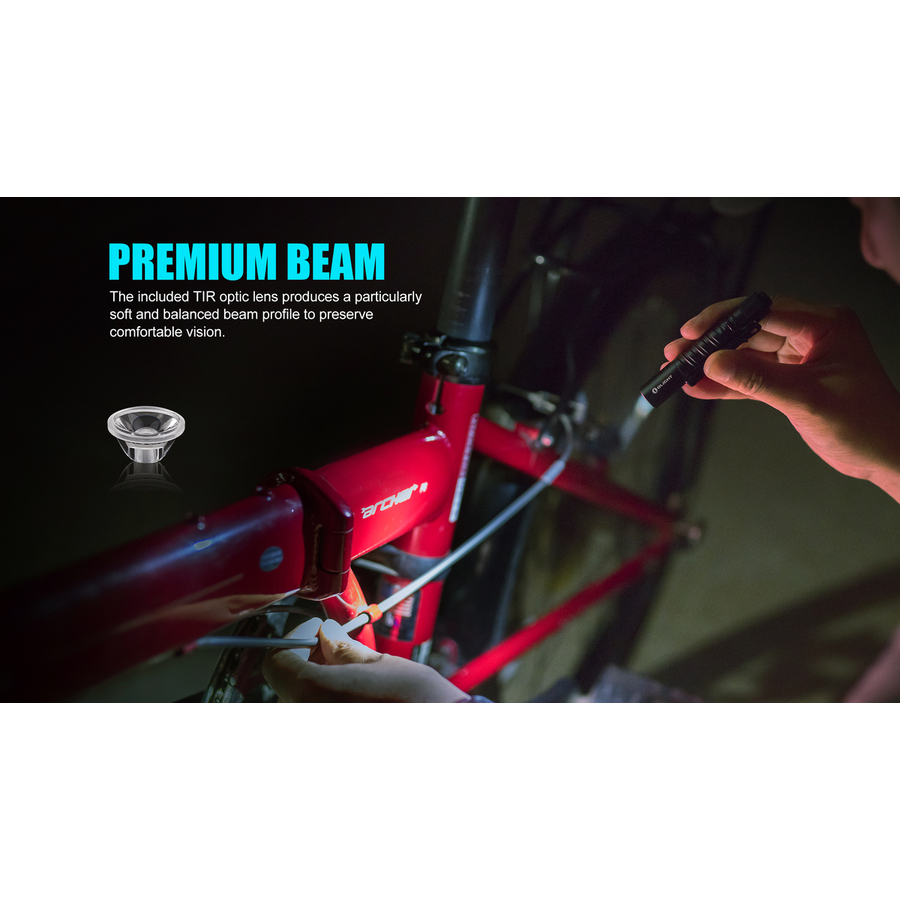 Оптична система представлена поєднанням світлодіода Philips Luxeon TX з TIR-лінзою, що забезпечує широкий промінь світла яскравістю 180 люмен. Управління ліхтарем просте і здійснюється за допомогою торцевої кнопки, яка здатна активувати один з двох режимів роботи: на 180 і на 5 люмен.