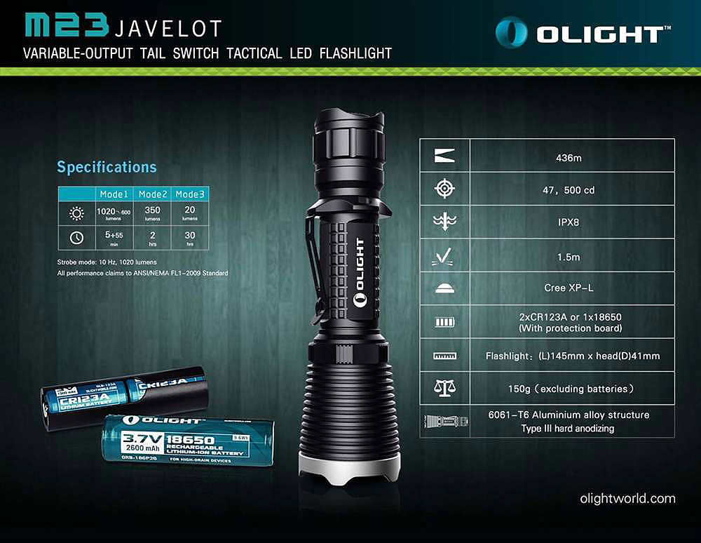 | Живлення | 1x 18650 або 2x CR123A | |||