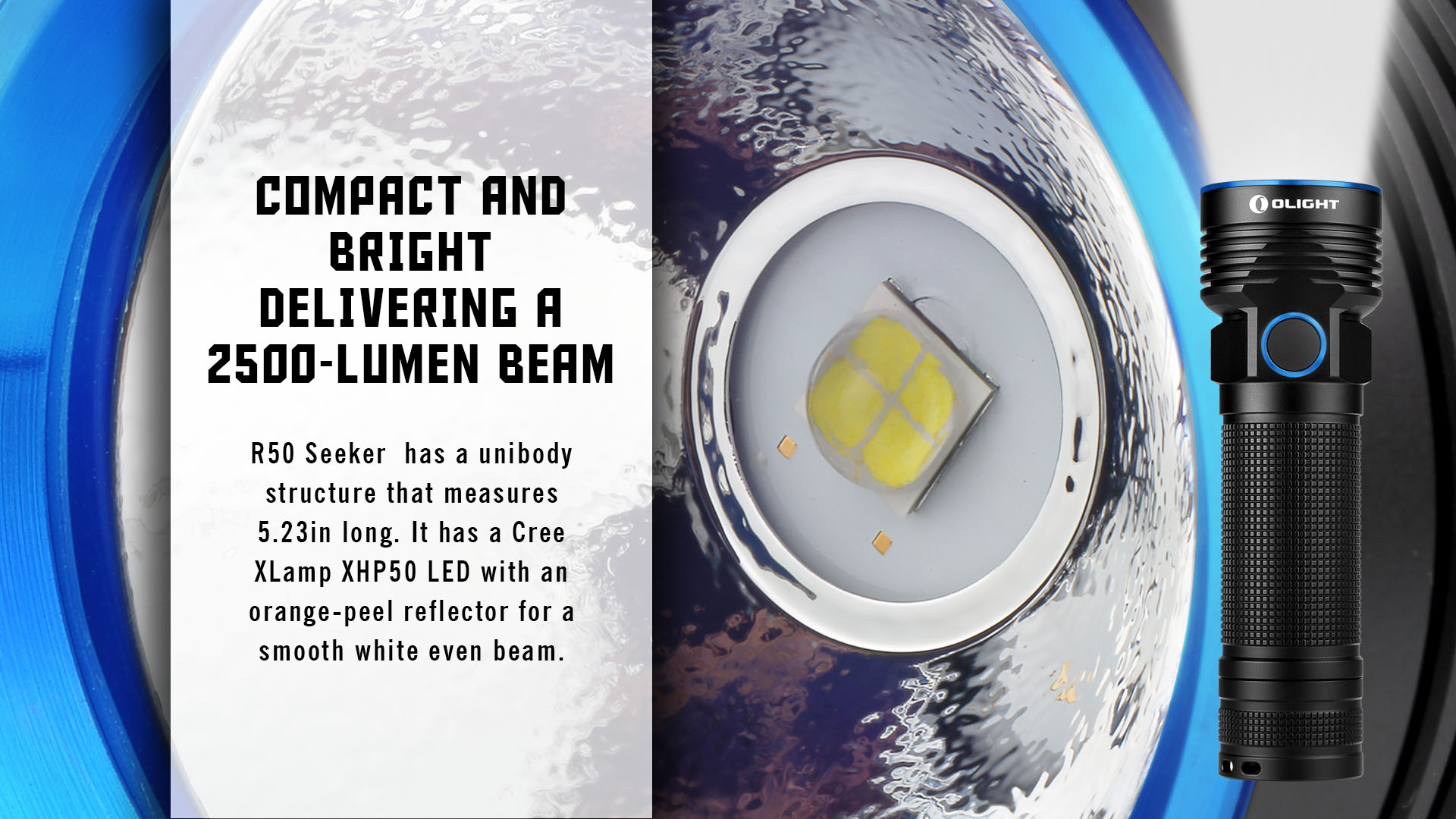Olight R50 Seeker – це потужний, яскравий та досить компактний ручний пошуковий ліхтар. Його максимальна яскравість досягає 2500 люменів, а дистанція променя становить майже 300 метрів. До послуг користувача ще 4 режими яскравості, які підійдуть для освітлення середніх та ближніх дистанцій, а також спеціальний режим строб.