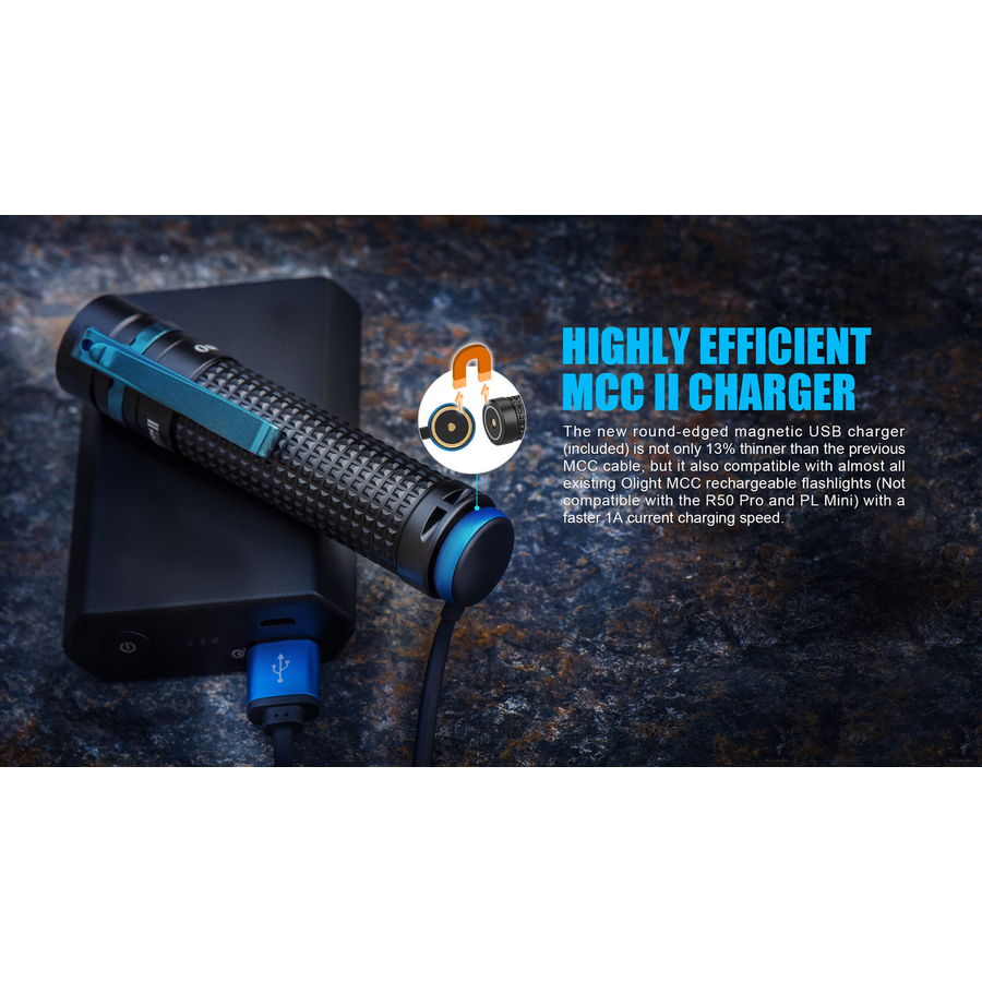 Купити ліхтар Olight S2R Baton II — відмінне рішення, якщо ви хочете мати у своєму розпорядженні ліхтар, що заряджається від USB. У комплекті є акумулятор ємністю 3200 mAh. Заряджати ліхтар можна від комп'ютера, ноутбука, powerbank'a або від розетки 220В за допомогою адаптера для мобільного телефону.