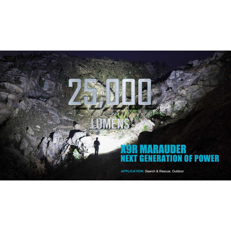 Olight X9R Marauder – новий флагман в лінійці надпотужних ліхтарів Olight. Яскравість даної моделі була збільшена до неймовірного показника в 25000 люмен, до цього найбільш потужним ліхтарем був X7R з 12000 люмен. Новий світловий монстр оснащений 6 світлодіодами Cree XHP 70.2, які здатні генерувати промінь світла дальністю до 630 метрів. Примітно, що, не дивлячись на високу дальність, промінь світла має надзвичайно широкий кут засвітки, що наближається до 160°. Завдяки застосованій оптичній системі X9R буде особливо актуальним при проведенні рятувальних або пошукових операцій, а також для полювання і риболовлі.