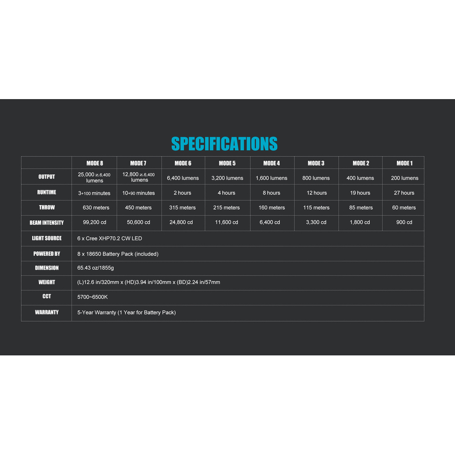 | Час безперервного світіння | 25000 Lm - 3 мин (6400 Lm — 100 мин)/12800 Lm - 10 мин (6400 Lm - 90 мин)/6400 Lm - 2 часа/3200 Lm — 4 часа/1600 Lm — 8 часов/800 Lm — 20 часов/200 Lm — 27 дней |