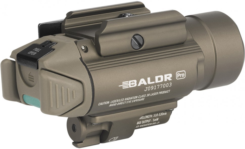 Olight Baldr Pro є покращеною версією PL-2 Baldr. Нова модель має збільшені світлові характеристиками, а також інший колір лазерного променя: на зміну червоному прийшов зелений. Одним із приємних доповнень є наявність 2-х режимів яскравості: на 1350 і 300 люмен, чого не було у попередника. Корпус ліхтаря практично не зазнав змін за винятком лазера, який став трохи компактніше. Оптична частина складається з високоефективної TIR-лінзи, яка знаходиться під мінеральним склом і світлодіод CREE XHP-35 HI з нейтральним відтінком світла. Ліхтар встановлюється на планку Picatinny або Weaver, кріплення інтегроване швидкозйомне. Живлення ліхтаря здійснюється за рахунок 2-х батарей формату CR123A.