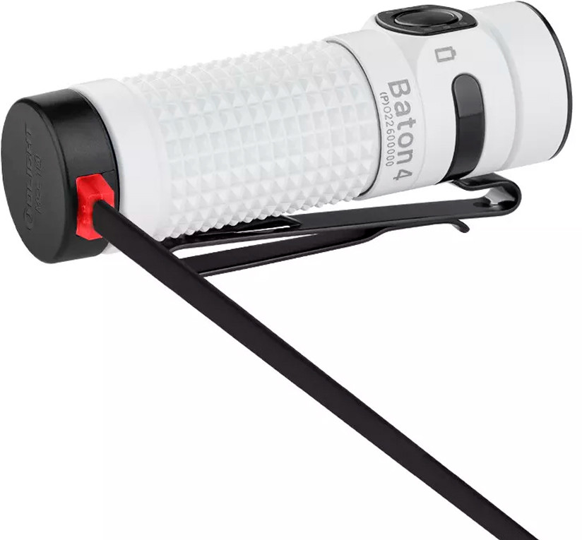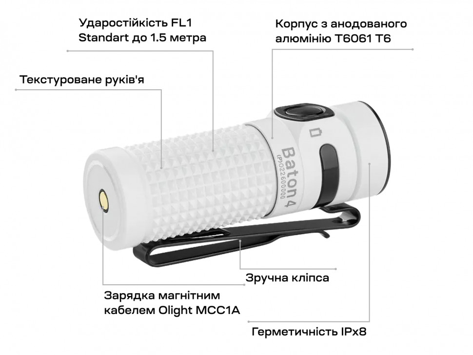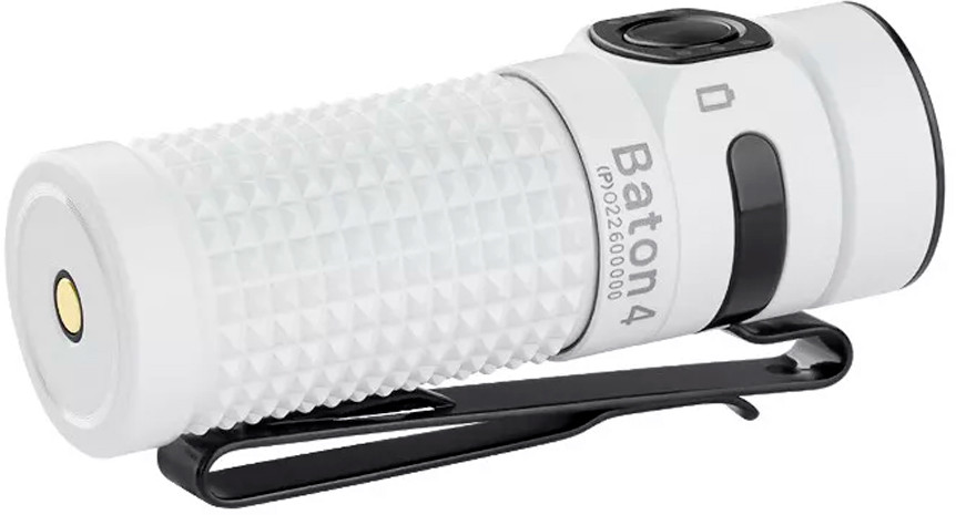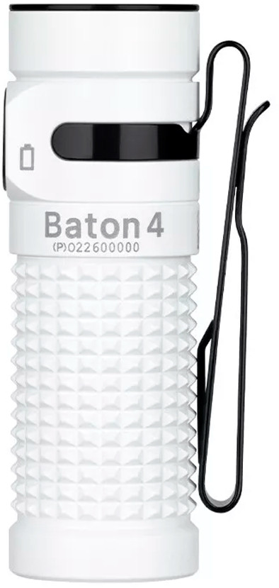 Baton 4 Premium - це еволюційне продовження серії невеликих кишенькових ліхтарів від Olight. Ліхтар отримав високоефективний світлодіод CW LED з оптикою TIR, які забезпечують світловий потік до 1300 люмена на відстань до 170 метрів. Baton 4 Premium має 5 режимів освітлення та режим Strob, що перемикаються зручним металевим перемикачем. Ліхтар живиться від акумулятора IMR16340 на 650 мАг, який забезпечує до 30 днів роботи ( у мінімальному режимі 0.5 люмен), і заряджається за допомогою магнітного кабелю MCC 1 A, що входить до комплекту. Корпус Baton 4 Premium виготовлений з анодованого алюмінію та має текстуровану поверхню, яка забезпечить цупкий хват. Корпус має стандарт міцності FL1 та вологозахист IPX-8. Він витримує падіння з висоти до 1,5 метрів та занурення на глибину до 2 метрів протягом 30 хвилин.