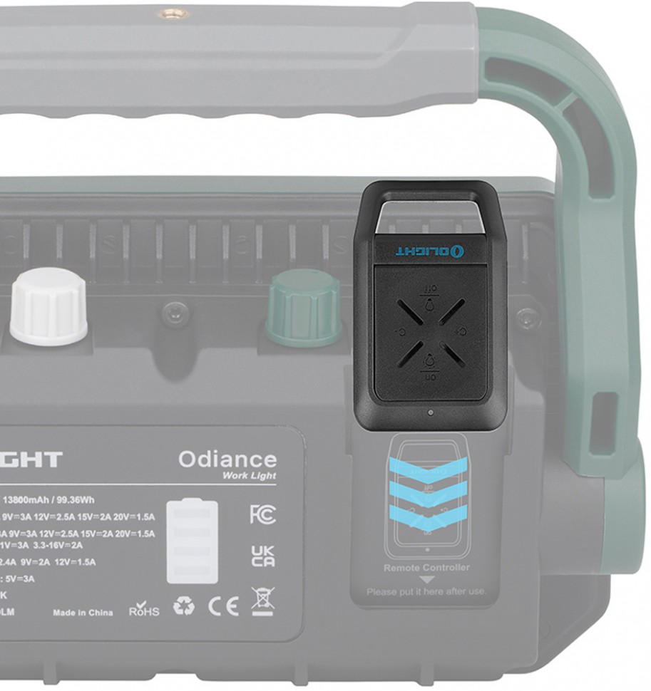 Ліхтар Olight Odiance – це багатофункціональний прожектор, який керується дистанційно за допомогою пульта. Максимальний рівень яскравості становить 3000 люменів, а дальність світіння до 75 м. Odiance регулюється не тільки за допомогою пульта дистанційного керування, але можна і вручну, плавно обертаючи перемикач яскравості. Вбудований Li-Ion акумулятор гарантує до 2800 хвилин безперервної роботи в мінімальному режимі. Заряджається ліхтар за допомогою магнітної зарядки, яка йде у комплекті. Завдяки інтегрованим портам типу USB Type-C та USB-A, ліхтар може працювати в режимі Power Bank. Корпус ліхтаря виконаний з алюмінієвого сплаву та має захист від потрапляння вологи за стандартом IPX5, а сама лінза захищена металевими ґратами. Також модель Odiance оснащена ручкою, що регулюється, яку можна використовувати як опору.