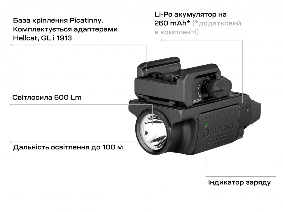 В комплекті з Olight PL-Mini 3 Valkyrie поставляється кріплення для планки Picatinny, та комплектні адаптери для планок Hellcat, GL і 1913. Також для покупки доступні додаткові адаптери G43X MOS, P365 та швидко скидна планка (продаються окремо).