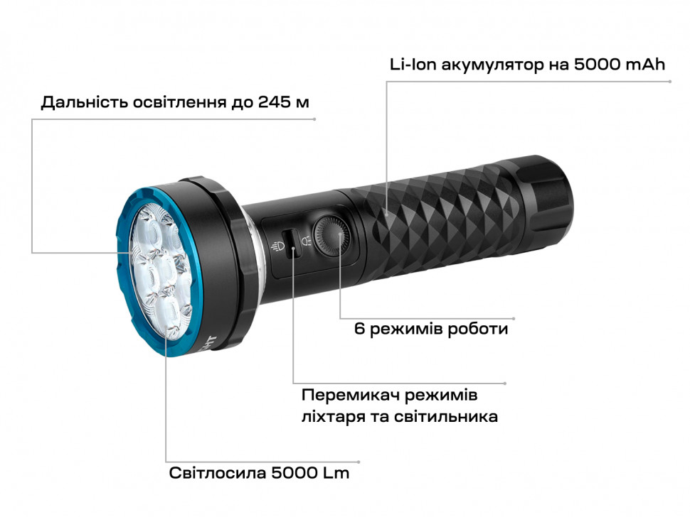 - Турбо / 5000-1200 лм / 245 м / 3 + 140 хв,
