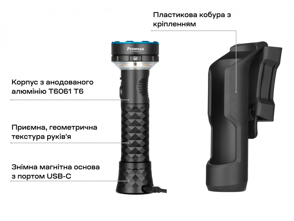 Пристрій живиться від акумулятора Li-Ion 21700 ємністю 5000 мАг та заряджається за допомогою USB або магнітного кабелю Olight MCC3 (не входить до комплекту). Olight Prowess отримав корпус з анодованого алюмінію A6061-T6 зі ступенем водонепроникності IPX7, що забезпечує захист від занурення в воду на глибину до 1 метра на термін до 30 хвилин, а також витримує падіння з висоти до 1 метра. В комплект поставки входить також клейке кріплення на стіну, а на нижній стороні знімної основи є різьблення 1/4" для прикручування ліхтаря на підставку, сумісну з цим кріпленням.