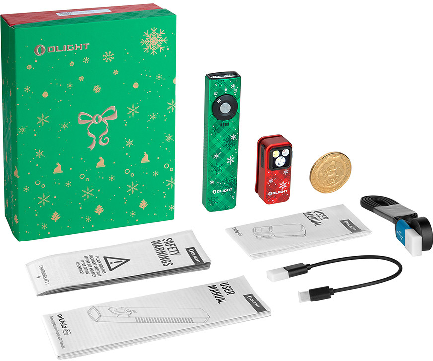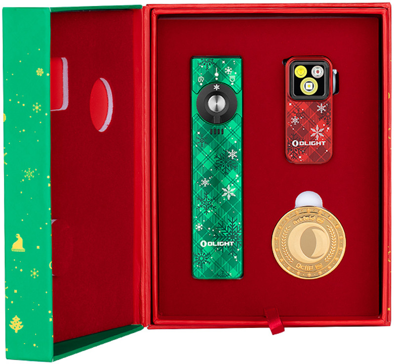 Olight Christmas Gift Box - це спеціальний подарунковий набір випущений компанією Olight до Різдва. Набір включає в себе розкішну, подарункову коробку всередині якої знаходяться два надзвичайно привабливі EDC ліхтарі - Arkfeld Pro та Oclip Pro в унікальному, новорічному дизайні. Окрім того, всередині знаходиться памятна, подарункова монета бренду. Olight Christmas Gift Box стане чудовим подарунком як собі, так і близькій вам людині, яка зможе впевнено освітлювати собі шлях, де б вона не була.