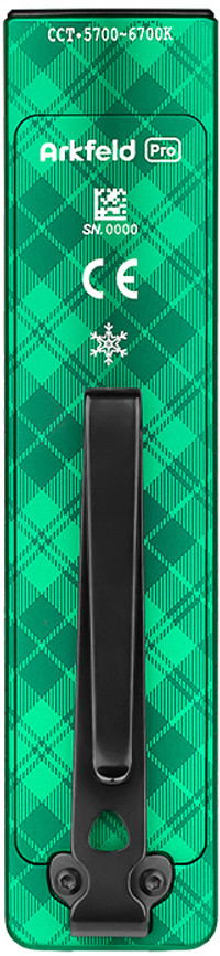 Arkfeld Pro - це покращена версія моделі Arkfeld - EDC ліхтаря від бренду Olight. Завдяки потужному світлодіоду High-Performance CW LED і оптиці TIR, забезпечується світловий потік до 1300 люменів на відстань до 102 метрів. Модель додатково оснащена режимом світла UV потужністю 900 mW і лазерним цілевказником зеленого кольору потужністю 0,39 mW класу 1R. Ультрафіолетове світло дозволяє перевіряти справжність банкнот і документів з водяними знаками. Також допомагає виявити флуоресцентні елементи, які не видно неозброєним оком.