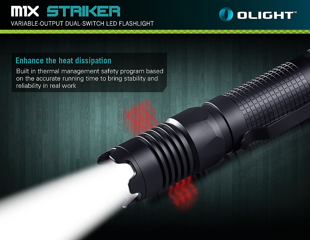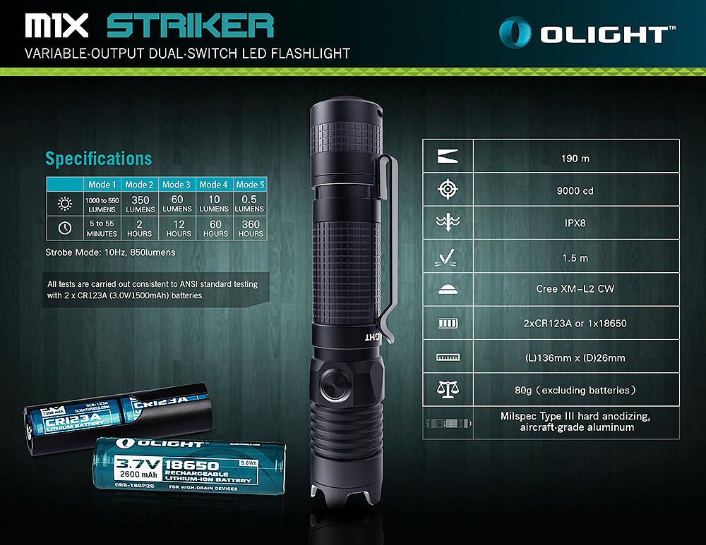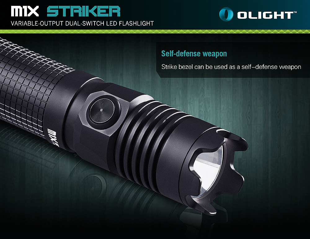 Olight M1X Striker – компактний, легкий та яскравий тактичний ліхтар. Особливість цієї моделі – наявність агресивного безелю, завдяки чому можна використовувати ліхтар як ударний інструмент. Живлення ліхтаря забезпечує 1 акумулятор 18650.