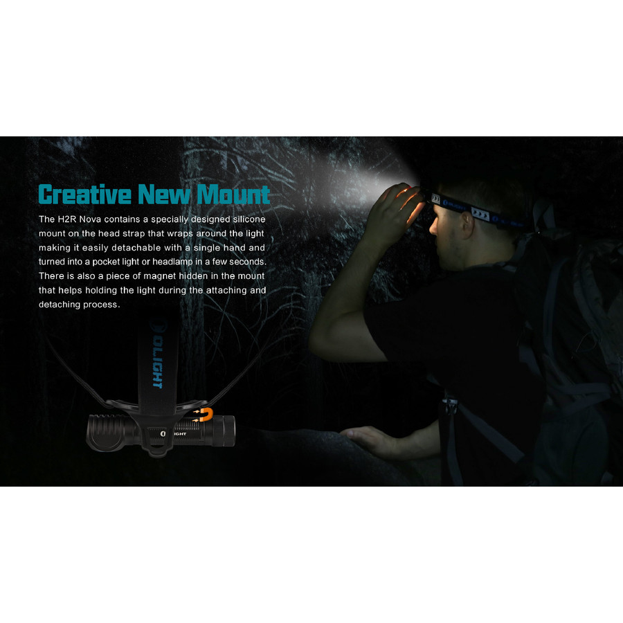 Налобний ліхтар Olight H2R Nova – це яскраве, зручне в експлуатації та універсальне джерело освітлення. Ліхтар однаково добре висвітлює як віддалені об'єкти, так і простір поблизу та збоку. Така якість освітлення досягається завдяки визначним показникам максимальної яскравості в 2000 люмен та спеціальної лінзі, яка ефективно розсіює світло.